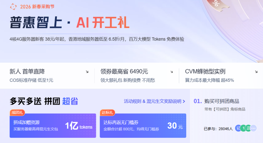 腾讯云开启了“2026年春季特惠”促销活动,为开发者和中小企业提供全方位的云算力支持。本次促销活动包括了轻量应用服务器、云服务器 CVM、云数据库、精选云产品等多个核心产品。更有4核4G的便宜VPS,新客 38元/年起,香港地域服务器低至 6.5折/月,百万大模型 Tokens 免费体验。